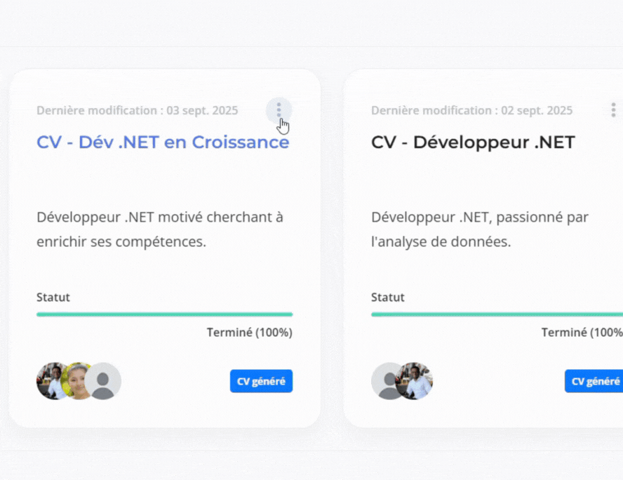 En quelques clics, générez un CV structuré, adapté à votre domaine et mis en page selon les standards professionnels. Notre IA vous propose des formulations optimisées pour chaque expérience.